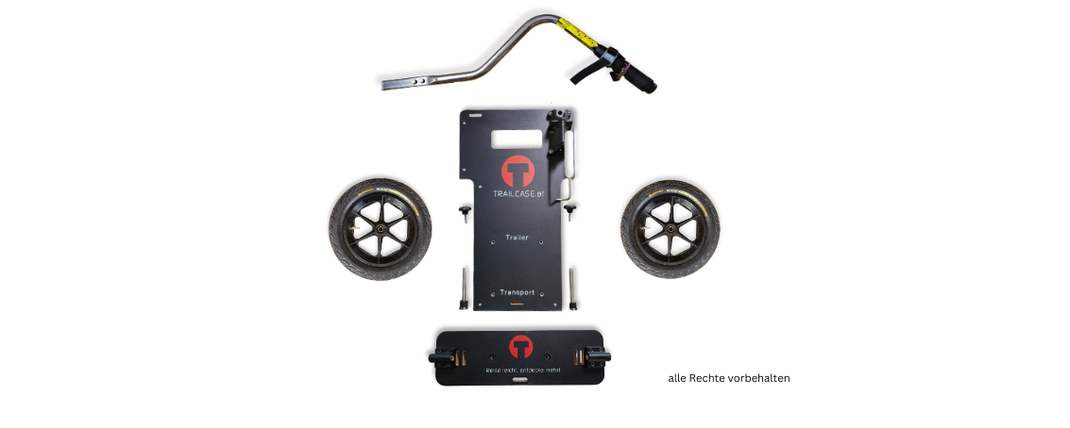 Ein Trailcase ist ein vielseitiger Begleiter, der aus mehreren Einzelteilen besteht und daher in einem Gepäckstück verstaut werden kann. Das gesamte Set besteht aus Luftreifen (12 Zoll), Trailcase mit Deichselhalterung inkl. Ständer, Achsenhalterung, Fahrraddeichsel und einer Anhängerkupplung.